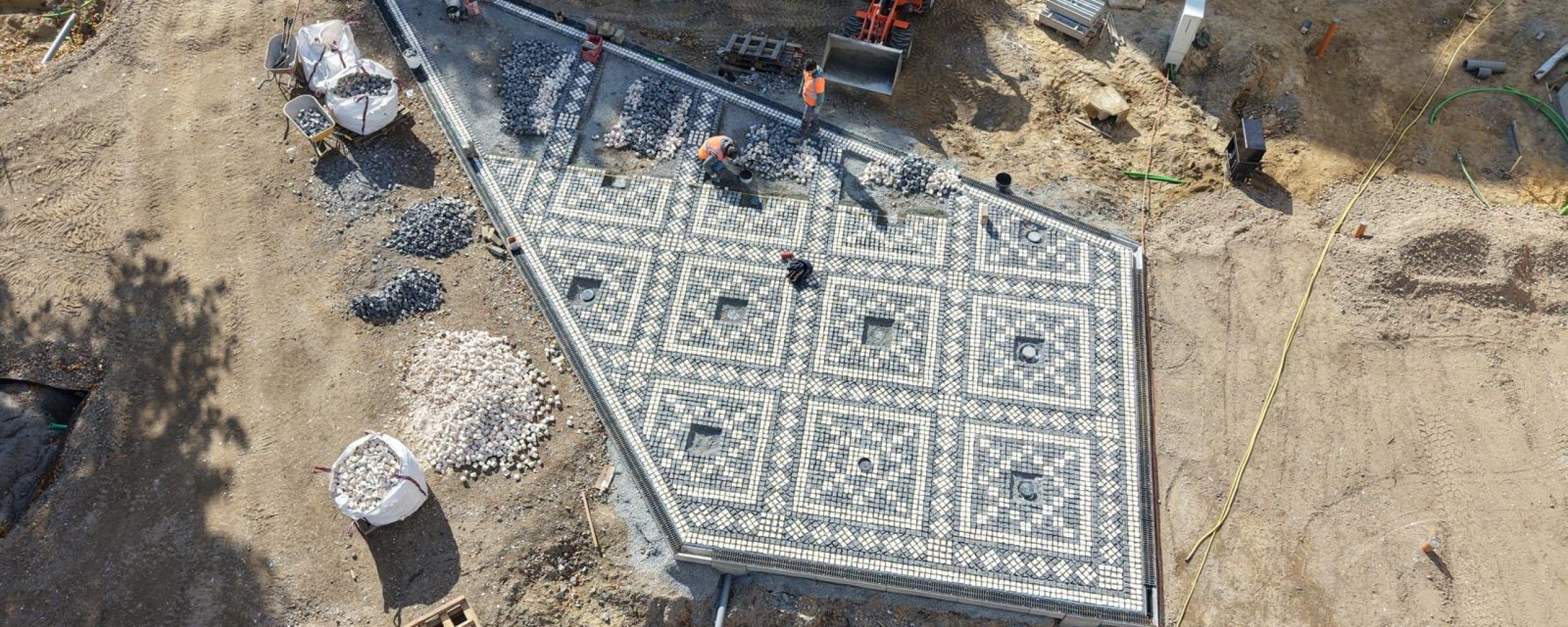 Een bijzonder onderdeel van het nieuwe Raadhuisplein is de mozaïekvloer van natuursteen. Deze vloer is geïnspireerd op de vloeren en pleinen die de Romeinen hier duizenden jaren geleden maakten. De mozaïekvloer verwijst ook naar de waterloop die de Romeinen aanlegden, tussen de Caumerbeek en de Geleenbeek, waarmee het badhuis van water werd voorzien. De vloer wordt straks het hart van het plein: een plek waar verleden en heden samenkomen en waar mensen elkaar kunnen ontmoeten.